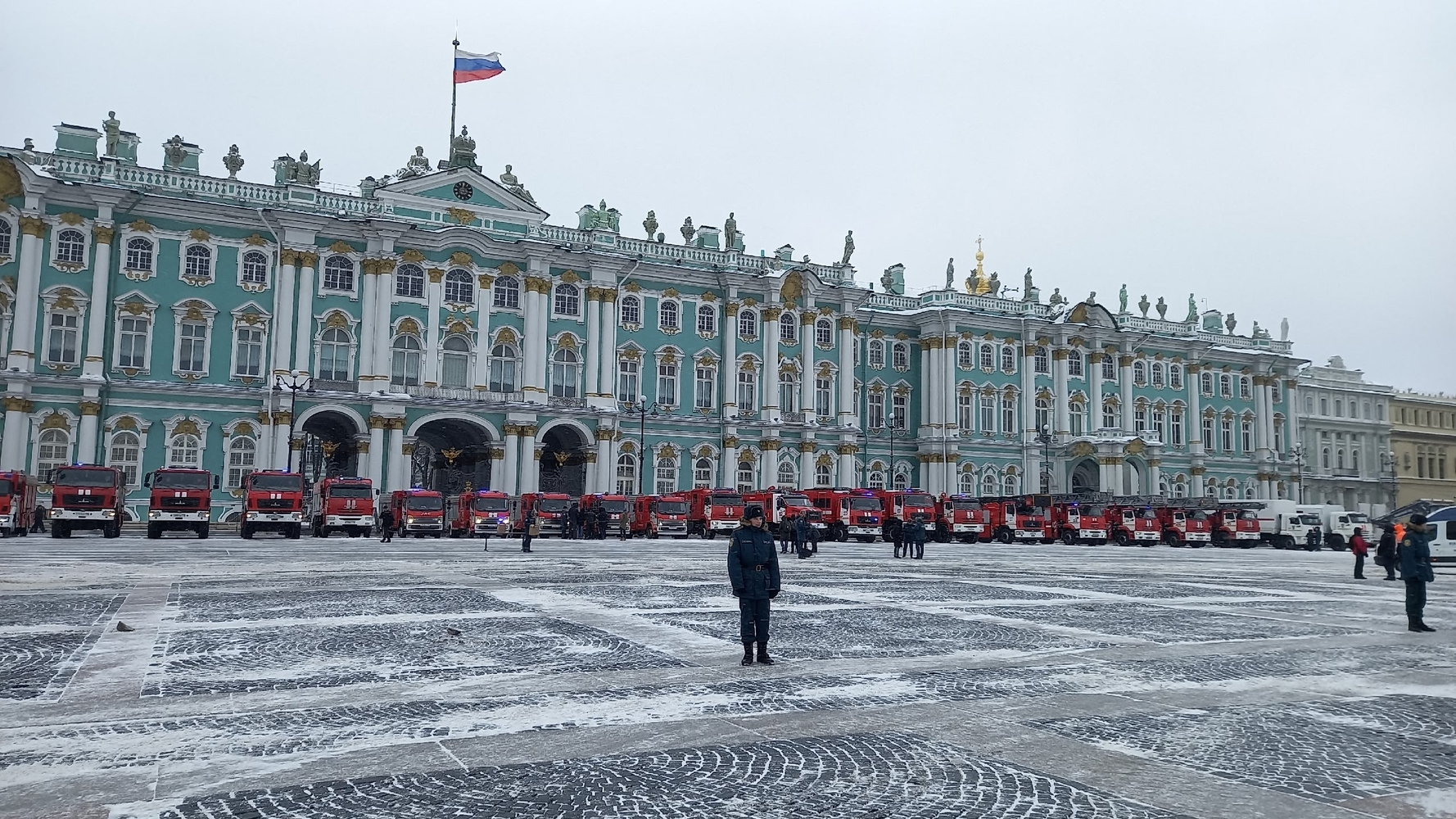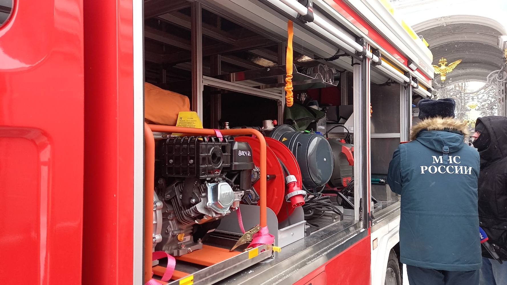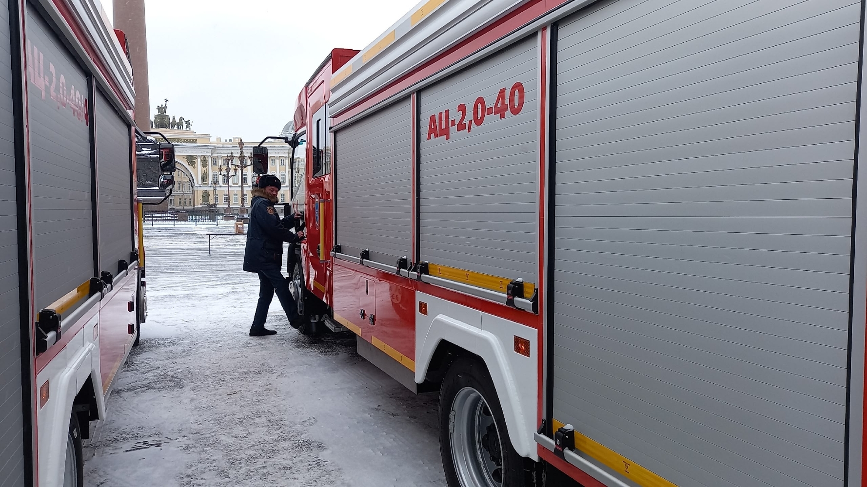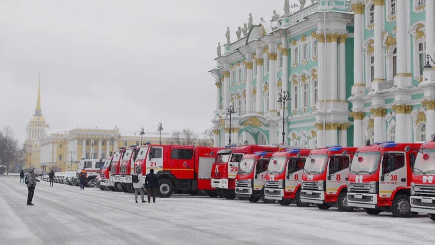Церемония вручения техники личному составу гарнизона прошла на Дворцовой площади при участии губернатора Санкт-Петербурга Александра Беглова и главы МЧС РФ Александра Куренкова.
